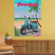 Poster de viagens de Patinete das Bermudas - poster de viagens retrorreflector das Bermudas com uma bicicleta de patinete retrô em uma praia arenosa.