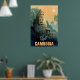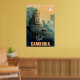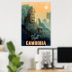 Este incrível poster de viagens apresenta uma estátua cambojana com um rosto feito de pedra durante o pôr do sol no meio da selva. #viagem #aventura #cambodia #moderno #retrô #stonestatona #selva #selva #diversão #pedra #cara #velho #antigo