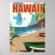 Poster de viagens vintage do Havaí de um barco de pesca velho numa praia arenosa.