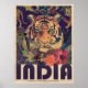 Exclusivo para a República da Vintage este poster de viagens colorido da Índia apresenta uma ilustração exótica multicolorido de elementos, incluindo um tigre de olhos verdes e flores sobre e indgo
