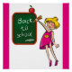 GAROTA ESCREVENDO "DE VOLTA À ESCOLA" NO QUADRO, COM UMA MAÇÃ PARA O PROFESSOR