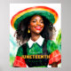 Esta poster apresenta a arte original de aquarela de uma bonito negra com cabelo encaracolado e batom vermelho vestindo uma roupa preta, amarela, verde e vermelha com vestido e chapéu. Ela está sorrindo feliz, olhando para o lado. Texto diz: 19 de junho, 19 de junho, Dia da Liberdade.