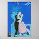 Meia-noite, Beija Arte Deco. Ilustração Art Deco de 1921. O artista francês Georges Barbier foi famoso por sua bela e viva representação da vida noturna parisiense. Meia-noite Beijo retrata um casal parado em uma sacada olhando o rio enquanto um barco segue à distância. O homem veste um smoking preto e se inclina para um beijo enquanto a mulher veste um vestido rosado friamente, arco rosa e faixa de cabelo rosa. Duas pombas azuis voam acima delas para o céu noturno. Um presente romântico para fãs de Georges Barbier, Art Deco e Vintage Paris.
