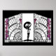 Esta composição fabulosa é um interessante olhar para um clássico do deco da arte - uma beleza balnear com um parasol na silhueta. Ela está flanqueada em ambos os lados com fãs varridos e pequenas espirais com flores do estilo deco nas margens esquerda e direita. Descrito em preto com fundo branco, acentuado com os florais em pinks e púrpuras.