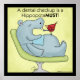 Uma imagem divertida para colocar em um consultório de odontologia ou em um dentista com senso de humor. Um grande hipopótamo se senta em uma cadeira dentária com a boca bem aberta enquanto um pássaro pequeno é tocado na barriga segurando um espelho dental pronto para fazer um exame. A legenda é uma peça de palavras dizendo, "Um checkup dental é um HippotaMUST!" Design original de Christie Black of Creations do Coração.