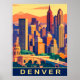 Denver poster de viagens. Vista no horizonte da cidade em cores vibrantes e laranja.