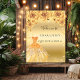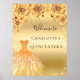Poster de boas-vindas para uma Quinceañera, festa de aniversário 15. Um fundo de ouro falso com pó de ouro falso, um vestido e rosas, florais. Personalize e adicione um nome. Para trás: sem design.