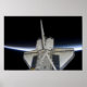 Descoberta de Shuttle Espacial intersetando a fina linha da atmosfera terrestre, enquanto ancorada com a Estação Espacial Internacional em destaque com o STS-131.