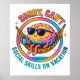 Design vibrante e colorido apresentando um personagem de desenho animado vestindo óculos escuros sentados tomando café com rede. O texto colorido diz: "Desculpe não pode ter habilidades sociais nas férias". Esse design está disponível em uma grande variedade de produtos.