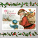 Vintage ilustração design de Natal vitoriano com um velho mundo Santa Claus carregando um saco de brinquedos ao lado de um menino.