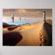 Composição de colagem fotográfica com uma paisagem surreal do deserto. Grandes dunas de areia, pegadas que levam a uma torre de vigia e ilhas flutuantes podem ser vistas em segundo plano.