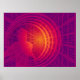 Uma imagem néon vívida com código binário e uma explosão solar e círculos brilhantes. Em roxo e laranja e rosa. Um esboço de uma pessoa parece ser consumido e absorvido por toda a alta tecnologia/código se movendo em direção à singularidade representada pela explosão solar brilhante no fundo.