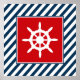 Design com temas náuticos com decoração das rodas de vela em quadrado sobre fundo listrado a azul e a branco
