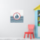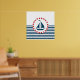 Design náutica com decoração de embarcações à vela em forma redonda, em fundo listrado a azul e a branco