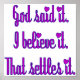 Letras roxas leem, "Deus disse. Eu acredito. Isso resolve." Corações pontilham os is. Maneira divertida de mostrar seu amor pela sua religião e sua fé em Deus. Ótimo presente para casamentos, ordenações, batismos, primeiras comunhões, confirmações e qualquer dia santo. Maravilhoso para Natal, Páscoa e aniversários também.