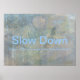 Em texto azul sobre um fundo digital em camadas em tons neutros, a mensagem inspiradora neste poster alerta, "Devagar: Você realmente quer chegar à linha de chegada mais rápido?"