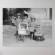 Foto antiga de meninas bonitinhas vestidas para o inverno, saindo com uma boneca em uma carruagem de bebê mais vadia. A menina mais pequena está cavalgando um triciclo de madeira.