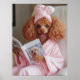Uma imagem hiperrealista de um charmoso poodle relaxando em um roupão rosa com uma toalha correspondente envolta em sua cabeça. O adorável cão está confortavelmente sentado numa cadeira, segurando uma revista com outro poodle no cobrir. A sua expressão divertida e a sua definição luxuosa do tipo spa tornam esta cena simultaneamente fofa e divertida.