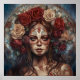 Dia dos Muertos da Arte Morta Apresentando um belo retrato de uma mulher com maquiagem do crânio de açúcar, cabelo escuro e rosas vermelhas.
