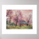 Linda aquarela em estilo impressionista. Um dia maravilhoso captado sobre um velho galpão de madeira em um campo de queda entre árvores áridas nas calçadas. Cor-de-rosa, lavanda, cor de laranja amarelo de pêssego, verdes e castanhos. Excelente adicional para casa ou escritório.