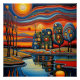 A.I. Interpretação criada de uma paisagem vibrante com espirais e padrões circulares capta um pôr do sol surreal sobre uma paisagem vitícola de estilizes árvores e um rio sereno.