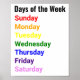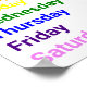 Uma ferramenta de aprendizagem para ensinar os dias da semana. No topo está o título: Dias da Semana (impressos a preto). Todos os dias da semana: domingo impresso em vermelho; segunda-feira impressa em laranja; terça-feira impressa em amarelo; quarta-feira impressa em verde; quinta-feira impressa em azul; sexta-feira impressa em indigo e sábado impresso em violeta.