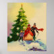 Old English Dickens style Christmas illustration with a family standing in the snow in front of a Christmas tree with bright burning candles.