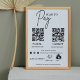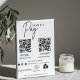 Em um estilo moderno minimalista, uma simples varredura personalizada de negócios brancos para pagar com o sinal de pedestal de código QR. O modelo adaptável é facilmente personalizável com códigos QR, texto personalizado, ícones de pagamento e ícones de mídia social.