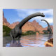 Dois dinossauros braquiossauros na água perto de montanhas rochosas vermelhas por um belo dia