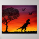 Fundo sunset com uma silhueta preta de uma árvore, um Tyrannosaurus Rex e dois Pterodactyls.