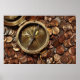 Uma velha bússola sobre um fundo de moedas.