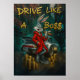 Uma peça de arte pop repleta de pântanos: um coelho de desenho inteligente de rua em um casaco de pele vermelha se inclina em um clássico turbo 911 em um beco iluminado por neon. O grafite Dourado diz "DIRIGIR COMO UM BO$", com pilhas de moedas e textura urbana suave. Cores escuras, linhas nítidas e uma vibração de paródia divertida — feitas para transformar qualquer parede em uma declaração.