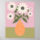 Disposição da Flor no Vase 02 - margaridas brancas e folhas verdes em vaso laranja num fundo rosa e verde.