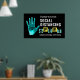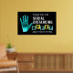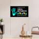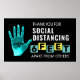Este poster foi criado para mostrar e lembrar a outros que seguiram as orientações para ajudar a retardar a propagação da pandemia de Coronavírus. O fundo é preto e um impressão de mão grande está no lado esquerdo com "Covid-19" no centro. "Obrigado pelo distanciamento social a 6 pés de distância dos outros" está em letras brancas, pretas, amarelas e turquesas em bloco ousado. A placa pode ser útil em um negócio, escola, creche, casa ou escritório.