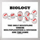 Mostre seu senso de humor biológico intenso com esta poster que apresenta o processo de mitose (divisão celular) junto com o seguinte truísmo científico: "Biologia A Única Disciplina Onde a Multiplicação e Divisão São Iguais".