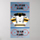 Poster com uma camisa de hóquei acima de uma réplica de gelo com bastões de hóquei cruzados e um disco disponível em uma grande variedade de combinações de cores de equipe. Personalize com o nome, o número e o nome da equipe do jogador. Faz um presente de excelente para jogadores de hóquei, treinadores de hóquei e fãs de hóquei, assim como jogadores de liga de fantasia de hóquei.