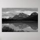 Um lago canadense reflete as montanhas e a paisagem, em preto e branco.
