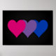 Poster com design de corações em cores de bissexualidade; riscas cor-de-rosa, roxo e azuis com bandeira bi de orgulho, design de amor do arco-íris em fundo preto
