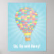 É hora de uma aventura! Decorar uma sala de infantários ou um quarto infantil com este poster de na moda que tem um balão de ar quente voador usando manchas em várias cores pastel do arco-íris e uma explosão de sol azul-claro para o fundo. O texto diz "Para cima, para cima e para fora!" que você pode personalizar com sua própria mensagem ou nome para crianças.