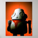 Robot de brinquedo vintage recortado 3d renderizado com fundo vermelho forte e retroiluminado.