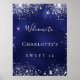 Um poster de boas-vindas para uma menina e glamourosa Doce 16, 16ª festa de aniversário. Um fundo azul marinho com brilhos elegantes de cintilação prateada. A cor azul é irregular. Personalize e adicione um nome. Cartas brancas. Traseira: sem design