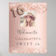 Um poster de boas-vindas para uma menina e glamourosa Doce 16, 16ª festa de aniversário. Um fundo rosa de gradiente dourado decorado com poeira falsa. Personalize e adicione uma foto e um nome. O número 16 é escrito com uma fonte no estilo do balão. Traseira: sem design