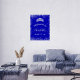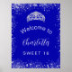 Um poster de boas-vindas para uma menina e glamourosa Doce 16, 16ª festa de aniversário. Um fundo azul real com poeira de prata suja elegante e uma tiara, coroa. Personalize e adicione um nome e uma idade. Cartas brancas. O nome é escrito com um moderno estilo escrito à mão.
