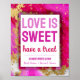 O plano de fundo apresenta um padrão de mármore robusto, magenta, arrojado e branco, cor-de-rosa quente, magenta, arrojado e branco, com falso floco de ouro. Encoraje os hóspedes a se ajudarem a sobremesas ou outros doces com este lindo sinal. Este sinal de parte está disponível em outras cores. Encontre este design em outro decorador de eventos e suprimentos de festas. Excelente para bat mitzvahs, aniversários, doces 16 festas, casamentos e até eventos corporativos e arrecadadores de fundos. Use as modelos de texto para atualizar uma data do evento, bem como o(s) nome(s) de convidado(s) de honra.