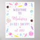 Bem-vindos aos convidados do seu partido com um sinal personalizado adorável. Enquadre o sinal e exiba-o numa mesa perto da entrada ou monte a espuma poster e mostre-a fora em um calcanhar. Este adorável design apresenta doces coloridos de água.