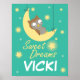 Um doce design de sonhos para bebês ou crianças pequenas. Um desejo de dormir tranquilamente em estilo cartoon com uma coruja fofa e a lua. O nome deve ser personalizado de acordo com a preferência. Um presente personalizado excelente para uma ocasião especial.