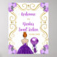 Este doce sinal de boas-vindas apresenta uma elegante estrutura dourada, uma bela princesa com cabelo vermelho e um vestido roxo, flores e um balão. Isto é perfeito para uma doce festa de aniversário de dezesseis.