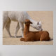 Duas alpacas jovens, uma branca e outra marrom, na areia