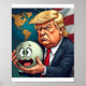 Ilustração de desenho animado de Donald Trump segurando uma bola com um rosto raivoso com o mundo americano atrás dele.