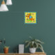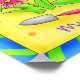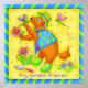 "Meus Amigos do Jardim". Este cão de jardineiro ama o seu jardim e amigos, libélulas. Ele deitou seu jardim para dar um sorriso de aquecimento cardíaco a uma libélula descansando sobre sua pata. O cachorro está vestido com um colete azul, botas verdes e um chapéu de jardim verde e está segurando uma flor enquanto conversa com a libélula. Plantas com flores roxas e rosa estão no jardim. O fundo é amarelo com pontos laranja e a borda é azul com faixas verdes. Este adorável Cachorro de Jardineiro vai aquecer seu coração.